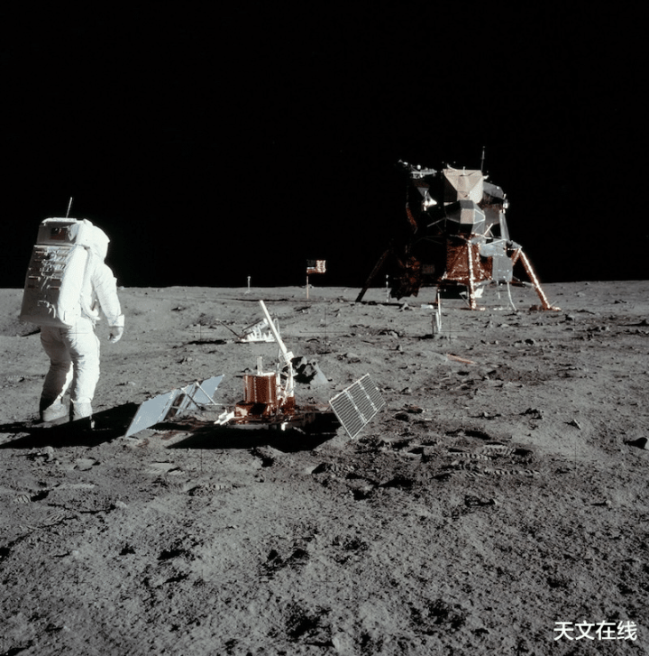 宇航员巴兹奥尔德林在阿波罗11号登月任务的月面行交运期部署了一项地震执行,用于探伤可能发生的月震。该执行安装包含4个地震仪,由两块太阳能电板板供电。月震可能对将来的宇航员组成要挟。图片由NASA提供。