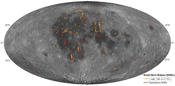 一项新的全球月球微型月海皱脊散布图标明,月球近期的构造行径比以往闪现的更为平凡,这扩大了月震潜在震源的界限。